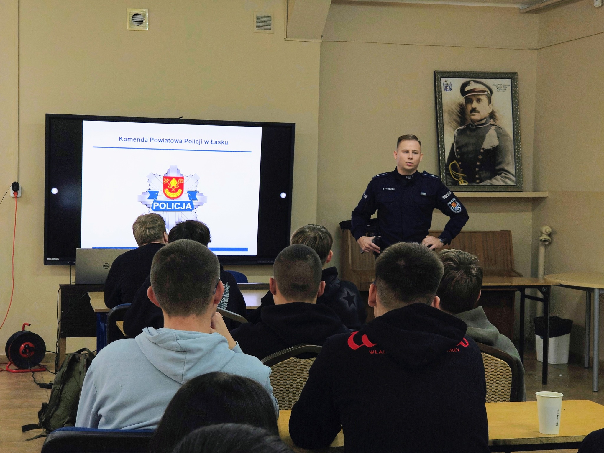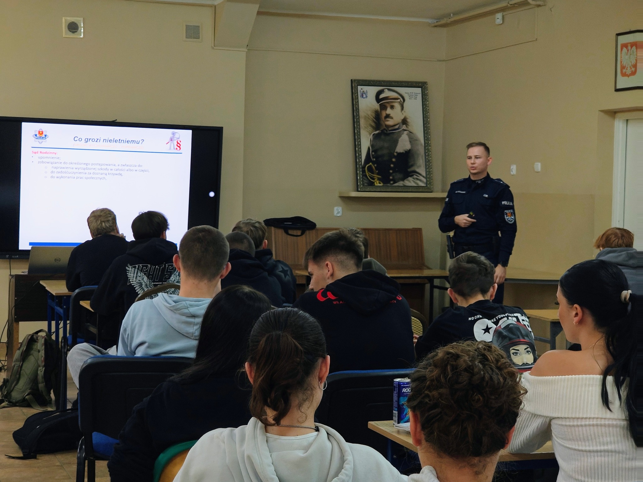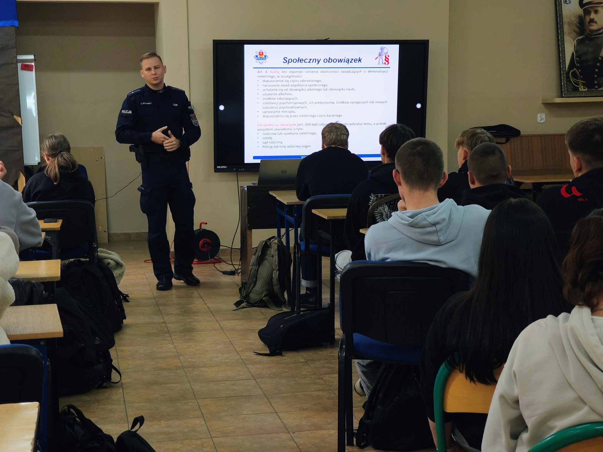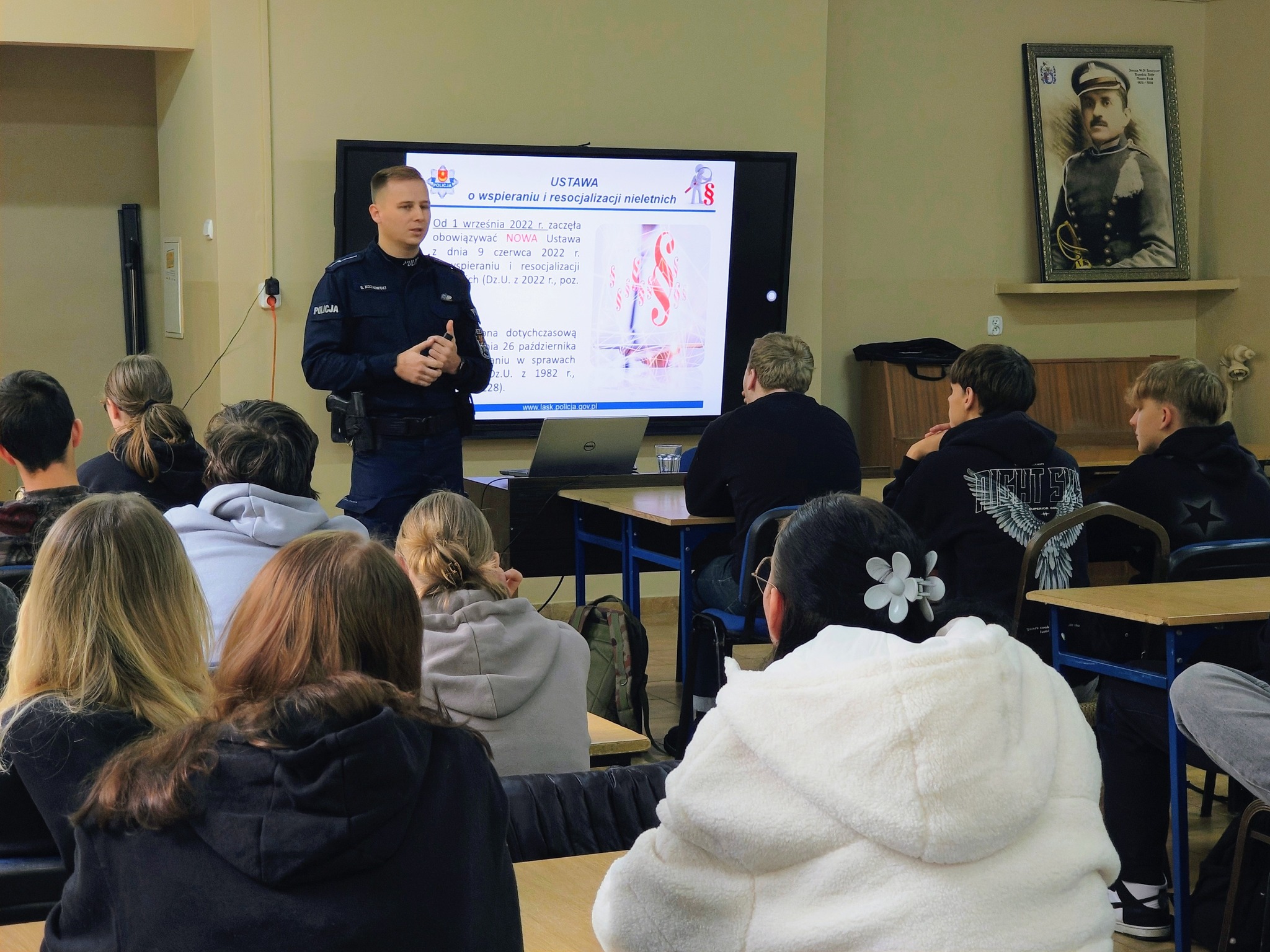 Policjant z Komendy Powiatowej Policji w Łasku spotkał się z uczniami ZSM-T w Ostrowie, by porozmawiać o przemocy wśród młodzieży oraz odpowiedzialności prawnej nieletnich .