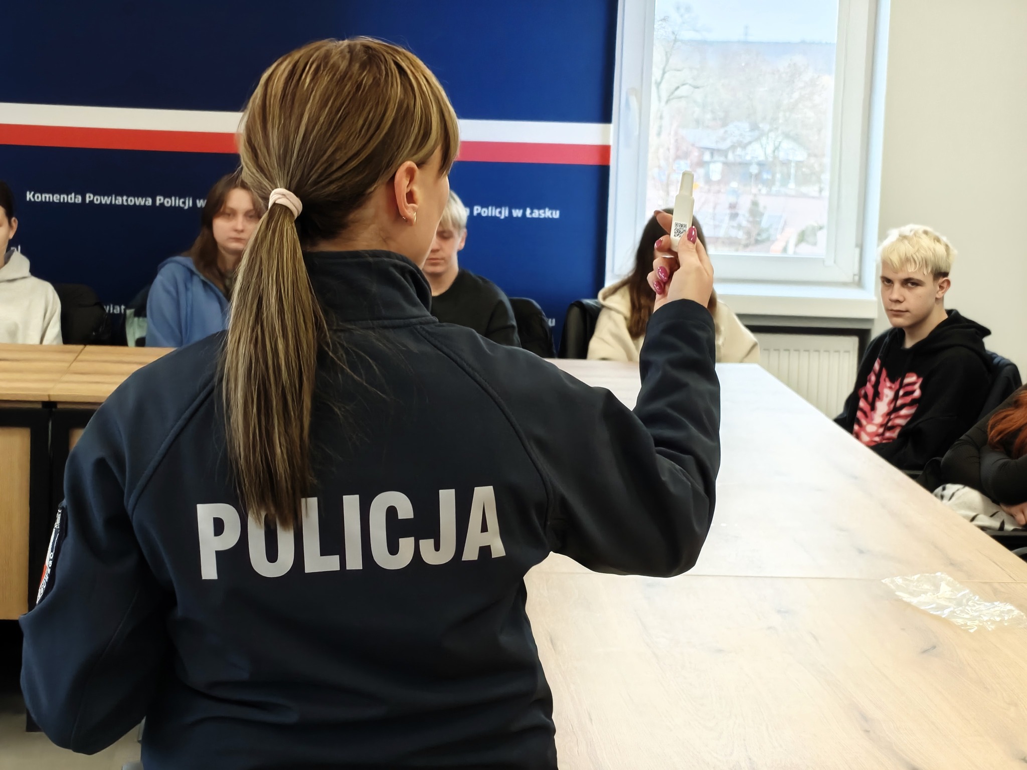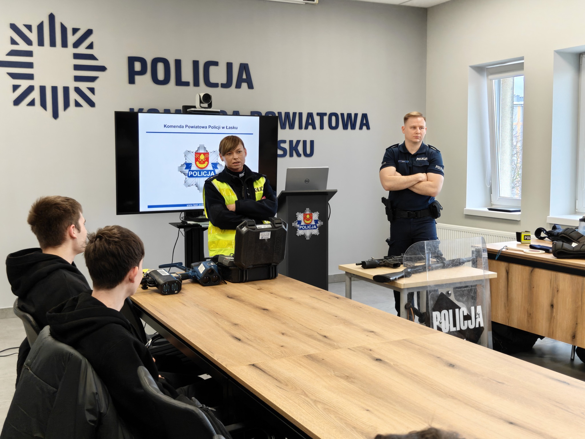 Pierwsza część spotkania odbyła się w auli jednostki. Oficer prasowy przybliżył specyfikę służby, omówił uprawnienia funkcjonariuszy oraz obowiązki obywateli. Wyjaśnił, czym jest legitymowanie, kontrola osobista, zatrzymanie i przeszukanie. Młodzież poznała także strukturę komendy oraz sprzęt wykorzystywany w codziennej służbie.