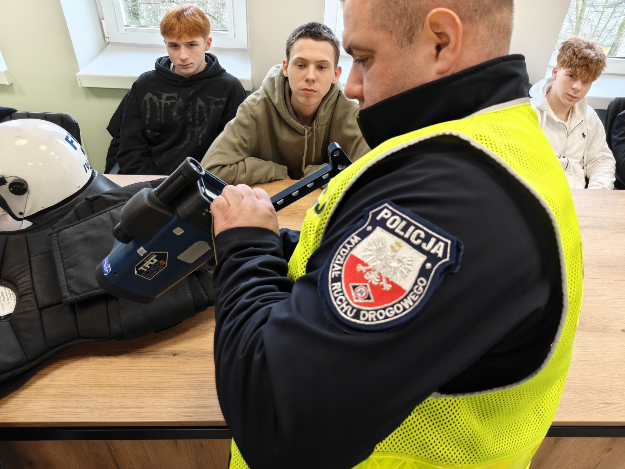 Kolejny blok zajęć poprowadzili policjanci ruchu drogowego. Zaprezentowali działanie mierników prędkości, urządzeń do badania trzeźwości oraz narkotestera. Opowiedzieli o realiach służby i sytuacjach, z jakimi spotykają się podczas kontroli drogowych.